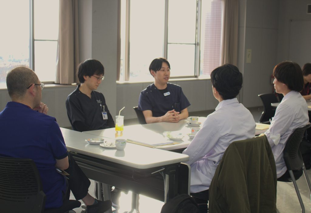 院内見学後のコーヒーブレイクでは、指導医や研修医との意見交換を楽しんでいただきました。学生さんから研修医に向けて、当院を選んだ理由や研修の雰囲気、プライベートな時間の確保方法など、様々な内容を積極的に質問していただきました。